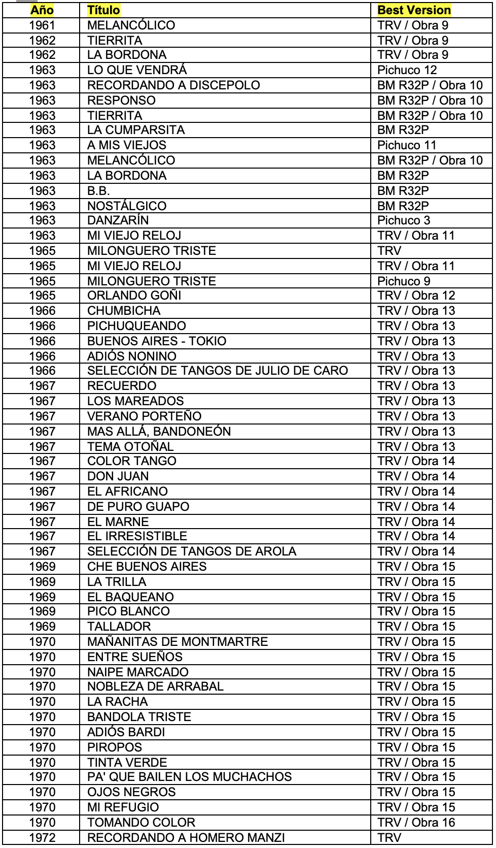 Obra Completa en RCA is a 16-CD series released in 1997 consists of the complete magnificent work recorded by Troilo in RCA Victor. The transfers of the last eight CDs (Vol. 9-16) are authentic master tapes transfers without extra seasonings. They are precious and hard to find even for TJs.